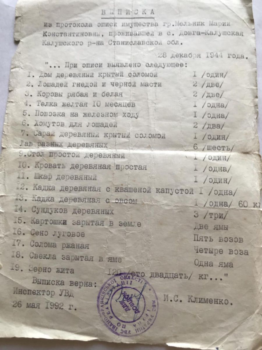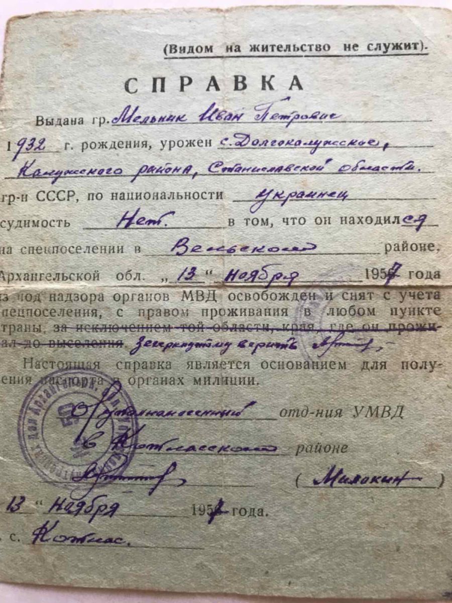 «Громадянин Мельник Іван Петрович 1932 р. н., народжений у с. Довга-Калуська Калуського р-ну Станіславської області, який знаходився на спецпоселенні у Вельському районі Архангельської області, 13 листопада 1957 р. звільнений з-під нагляду органів МВС і знятий з обліку спецпоселення з правом проживання в будь-якому пункті країни.