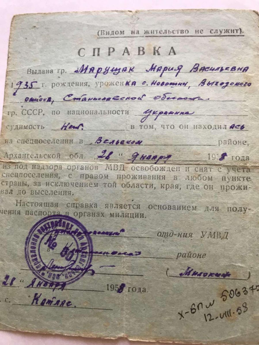 Таку ж довідку від 28 січня 1958 року про реабілітацію отримує і дружина Марія.