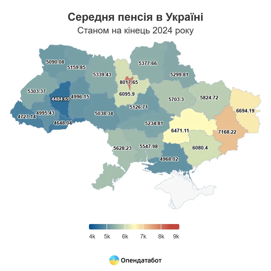 Найвищі виплати традиційно у пенсіонерів в Києві — 8 017,65 грн. Це більш ніж на третину вище за середній показник по Україні. Найменші виплати у Тернопільській області — 4 484,69 грн. Це на 23% менше за середнє значення.