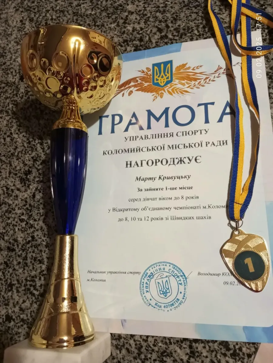 Зазначається, що на чемпіонаті зі швидких шахів Марта Кривуцька зайняла перше місце серед дівчат до 8 років.