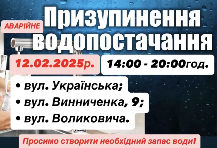 КП "Калуська енергетична Компанія" повідомило про аварійне призупинення водопостачання у середу, 12 лютого, з 14:00.