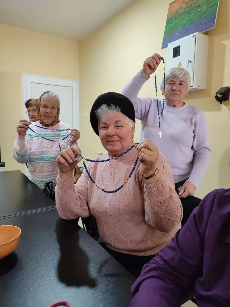 Директор «Карітас-Калуш» о. Ігор Пришляк запропонував провести майстер-клас в Центрі життєстійкості зі слухачками Університету третього віку. За півтори години кожна із 12 жінок виготовила по одному молитовному оберегу для захисників.