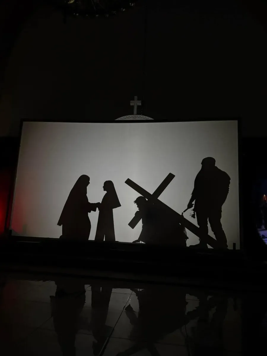 Приблизно годину часу тривала Хресна дорога в тінях. Музика, релігійні пісні та озвучення, вимкнене у храмі світло (тільки спецефекти екрану. — Авт.) підсилювали її сприйняття. Під час 14 станцій присутні мали можливість пройти всі страждання разом з Ісусом та відчути його біль, а також роздумати над своєю роллю у цій Хресній дорозі.