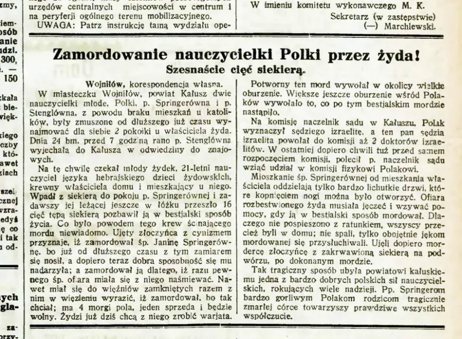 У містечку Войнилів Калуського повіту дві молоді польські вчительки, пані Шпрінгер і пані Штенґль, через брак квартир у католиків були змушені тривалий час винаймати дві кімнати для себе у власника-єврея. 24 числа цього місяця перед сьомою ранку пані Штенглівна виїхала в Калуш до друзів. Цього моменту чекав молодий єврей, 21-річний вчитель івриту для єврейських дітей, родич власника будинку який жив у нього. Він увірвався з сокирою в кімнату пані Шпрінгер і тупою сокирою, завдавши їй понад 16 ран, коли вона ще лежала в ліжку, брутально позбавив її життя. Що стало причиною цього кривавого вбивства, невідомо. Спійманий злочинець цинічно зізнається, що вбив покійну Яніну Шпрінгер, бо він давно про це думав і тільки тепер випала добра нагода; і він убив її, тому що одного разу жертва з нього насміхалася. Він навіть нібито висловлювався в’язням, які були замкнені разом з ним у в’язниці, що вбив її, тому що він цього хотів; має 4 сотки поля, продасть один і буде вільний. Євреї ж сьогодні хочуть зробити з нього божевільного.