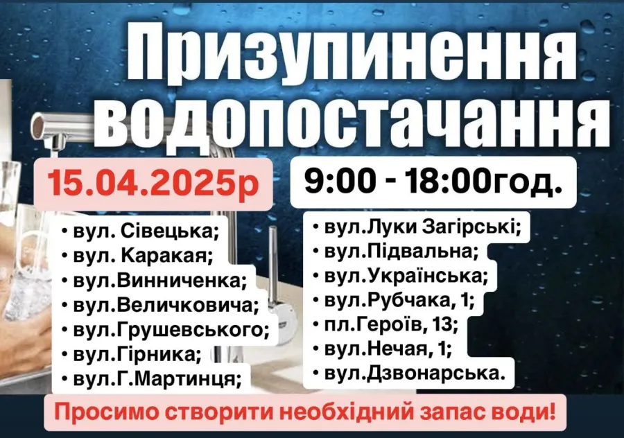Комунальне підприємство "Калуська енергетична Компанія" повідомило про тимчасове призупинення водопостачання у вівторок, 15 квітня, з 09:00.