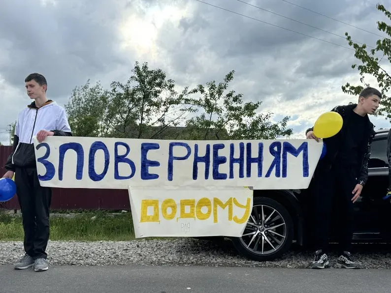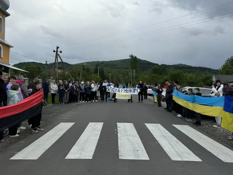 Рідні та односельці вийшли назустріч Олександру Складановському з квітами, плакатами та прапорами. Також учні місцевої школи створили для нього малюнки.