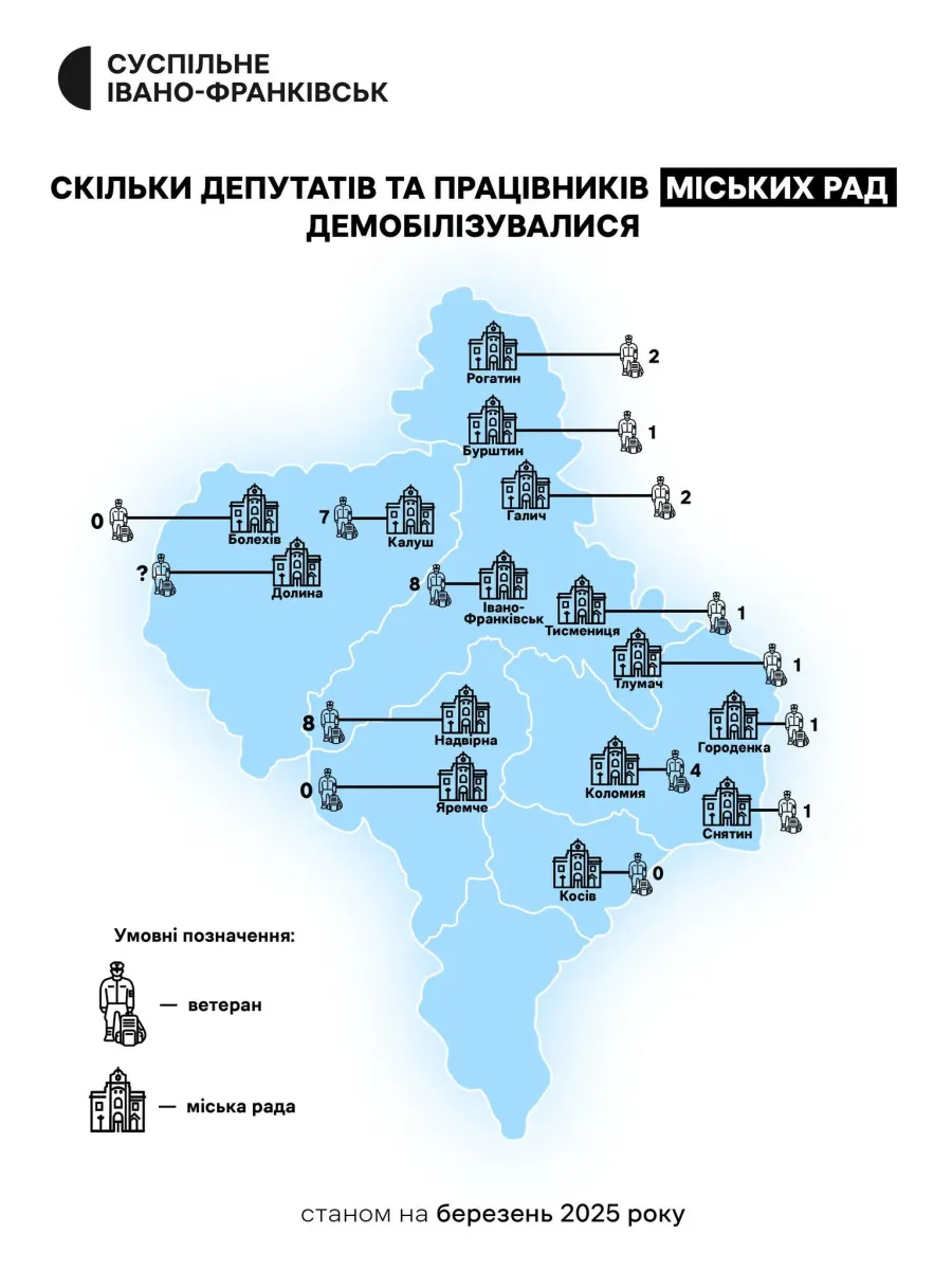 Також стало відомо, що семеро депутатів та працівників Калуської міської ради демобілізувалися. Загалом до березня 2025 року 36 працівників та депутатів міських рад Прикарпаття, які були у війську, демобілізувалися.