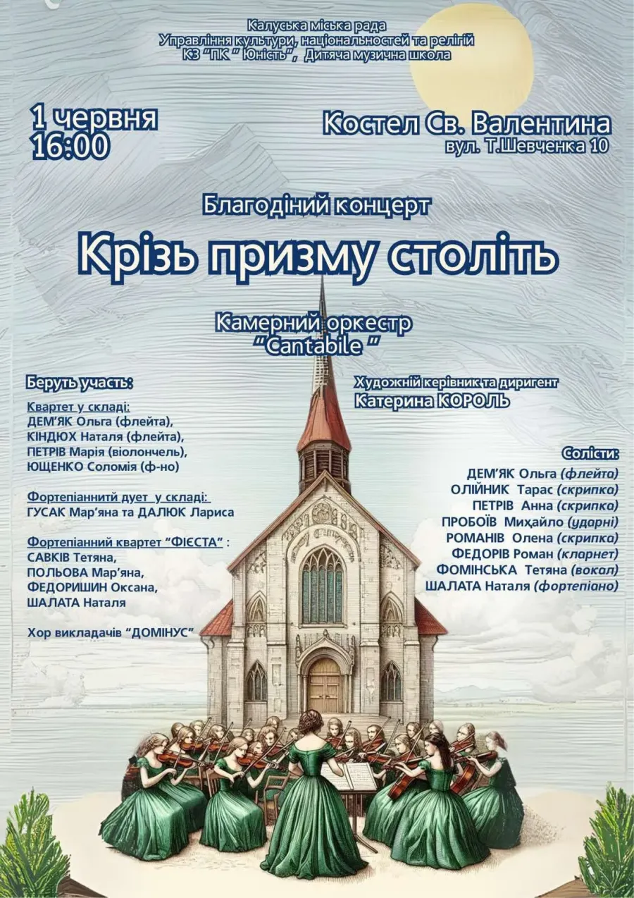У неділю, 1 червня, у костелі Святого Валентина (вул. Т. Шевченка, 10) відбудеться благодійний концерт "Крізь призму століть" камерного оркестру "Cantabile", повідомляє Калуська міська рада.