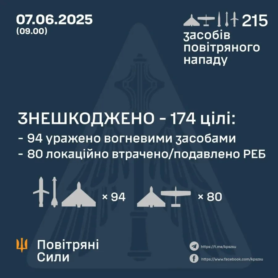 У ніч на 7 червня (із 22.00 6 червня) противник атакував 215-ма засобами повітряного нападу: