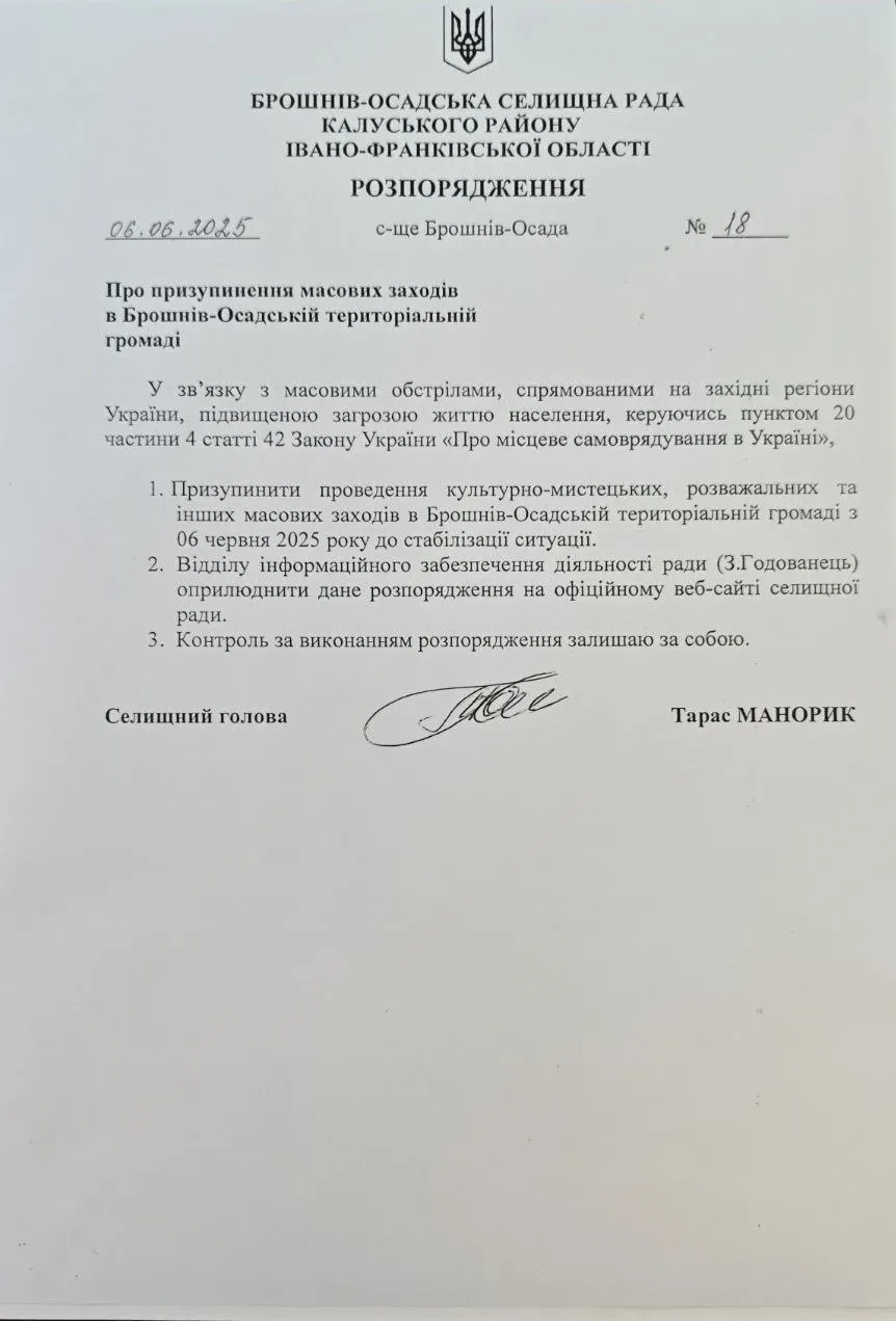 "Росіяни знову вдарили по Україні масштабними комбінованими атаками — постраждали південні, центральні та західні регіони України. Це про те, що росія хворіє війною, ненавистю і бажанням знищувати життя українців, тримаючи всіх у напрузі. Реагуючи на останні події, відповідно до ч. 4 ст. 42 Закону України «Про місцеве самоврядування в Україні» голова Брошнів-Осадської селищної ради Манорик Т. С. підписав розпорядження про призупинення проведення у громаді всіх масових заходів та заборону масових скупчень громадян. Зокрема, на території громади належить призупинити проведення культурно-просвітницьких, спортивних, розважальних та інших заходів з 06 червня 2025 р. до стабілізації ситуації. Життя і здоров’я жителів громади — найбільша цінність! Розпорядження є обов’язковим до виконання", — йдеться на Фейсбук-сторінці громади.