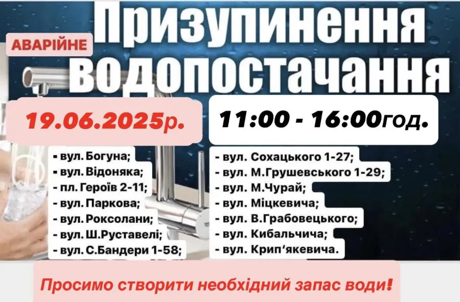 Водопостачання тимчасово призупиняють через проведення аварійних робіт з ліквідації пориву на вулиці Сохацького, 5, інформують "Вікна".