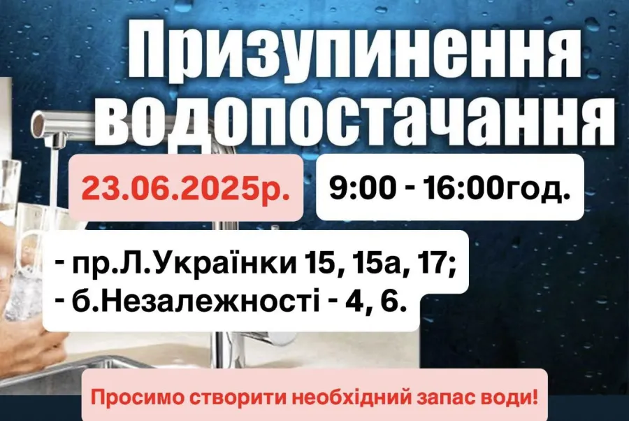 Водопостачання тимчасово призупиняється для проведення ремонтних робіт на бульварі Незалежності, 4 та проспекті Лесі Українки, 15б ("Троян").