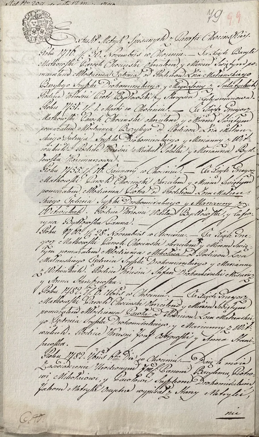 Року 1782 ч. 6 вересня в Хотіні. — Я священик Григорій Матковський парох Хотінський охрестив, і миром святим помазав немовля Павла, від родичів ложа подружнього Андрія Шишки Дрогомирецького, і Мар'яни з Вітвіцьких. — Родичі хресні Йосиф Островський і Анна Станішевська. —