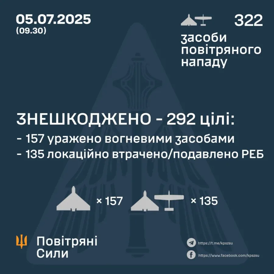 Станом на 09.30 протиповітряною обороною знешкоджено 292 ворожі БпЛА типу Shahed (безпілотники інших типів). 157 — збито вогневими засобами ураження, 135 — локаційно втрачені/подавлені РЕБ.