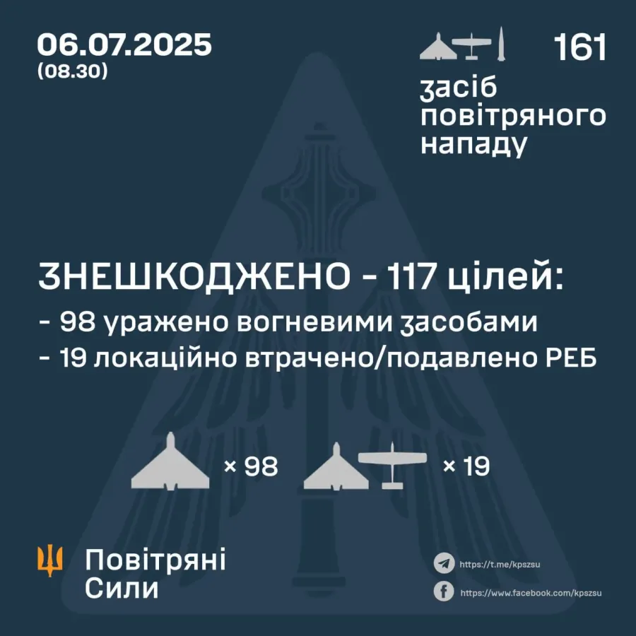 У ніч на 6 липня (із 20.30 5 липня) росіяни атакували 4 зенітними керованими ракетами С-300 із Курської області та 157-ма ударними БпЛА типу Shahed і безпілотниками-імітаторами різних типів із напрямків: Шаталово, Міллерово, Приморсько-Ахтарськ — рф, Гвардійське, Чауда — ТОТ Криму, повідомляють Повітряні сили.