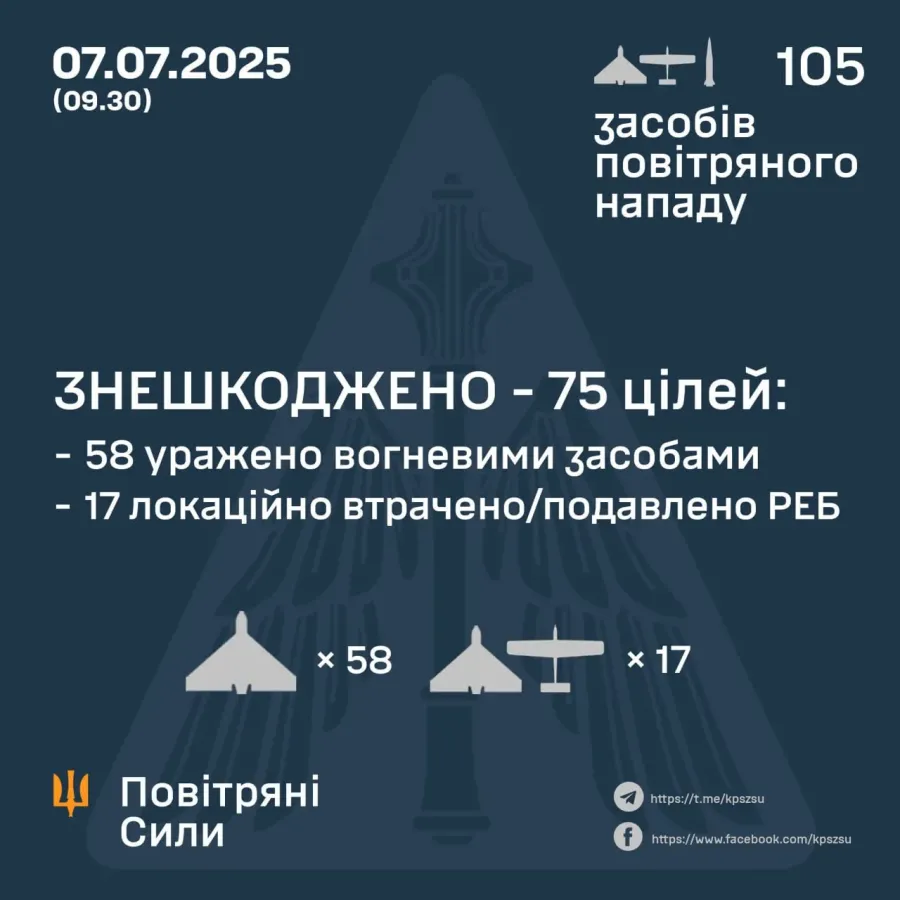 У ніч на 7 липня (із 21.30 6 липня) противник атакував 4-ма зенітними керованими ракетами С-300/400 із Курської обл. та 101-м ударним БпЛА типу Shahed і безпілотниками-імітаторами різних типів із напрямків: Міллерово, Приморсько-Ахтарськ – рф., Чауда – ТОТ Криму, повідомляють Повітряні сили.