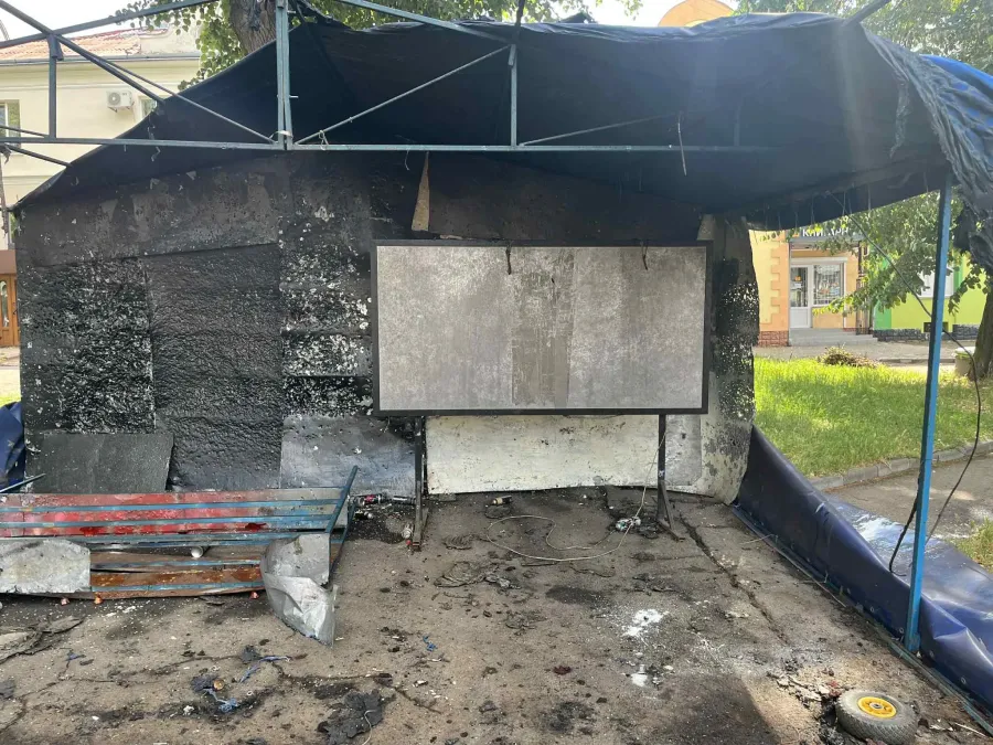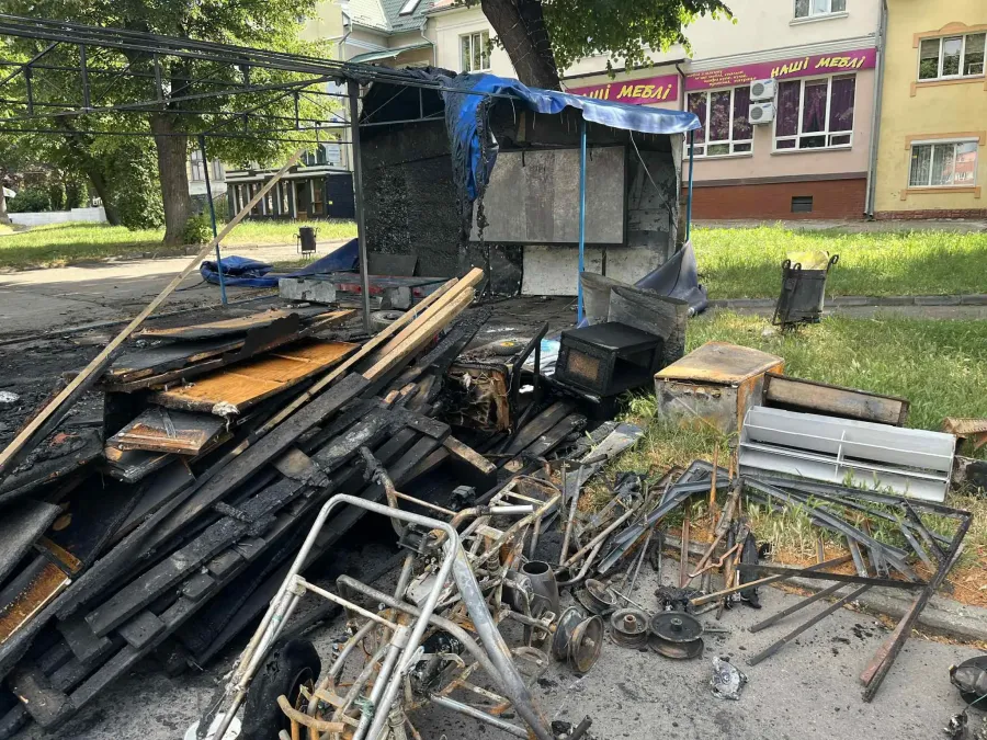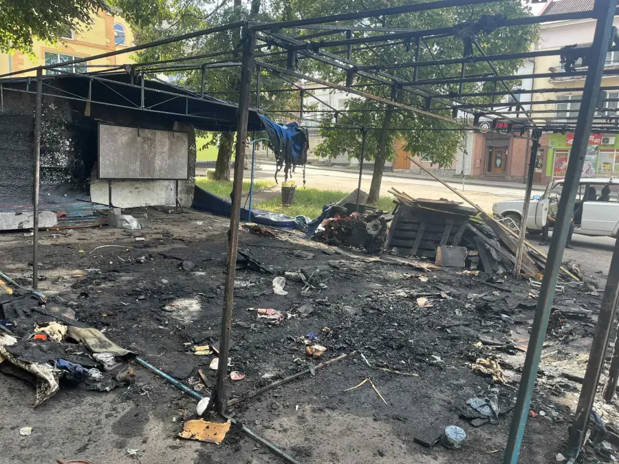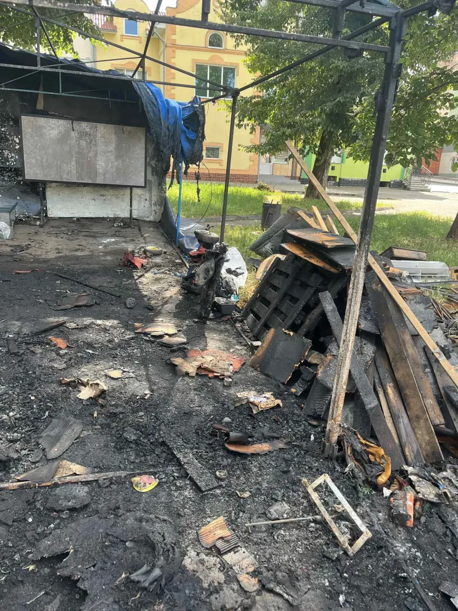 Сьогодні, 8 липня, від самого ранку на площі Героїв, де до вчорашнього вечора був дитячий тир, прибирають залишки згарища батьки власника пані Галина та пан Микола.