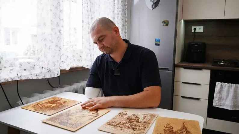"Першу картину розпочав 5 червня 2023 року в селі Ставки Донецької області. Пам'ятаю добре, як випалював її. Тут написано: "Завершено 30 серпня 2023, 18:41, Донбас". Мав деколи вільний час, хотів чимось корисним зайнятися. Коли зрозумів, що в мене вільного часу не буде, передав картини дружині, попросив полакувати. Одну ми віддали для аукціону. Її придбали за 30 тисяч гривень. Тепер, на жаль, немає правої руки. Вчуся випалювати лівою. Треба ще практикуватися, але вже потрохи виходить", — говорить ветеран.