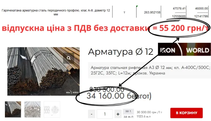 Гарячекатану арматурну сталь класу А-ІІІ та А500С діаметрами 12-25 мм врахували по однаковій ціні 55 200 грн/т. «Метінвест-СМЦ» в Івано-Франківську продає арматуру класу А400/500 діаметром 12-25 мм по однаковій ціні 33 950 грн/т, що в півтора раза дешевше. Компанія «Iron World» пропонує арматуру класу А-ІІІ та А400С/500С діаметром 12-20 мм по 34 160 грн/т, що на 38% дешевше.