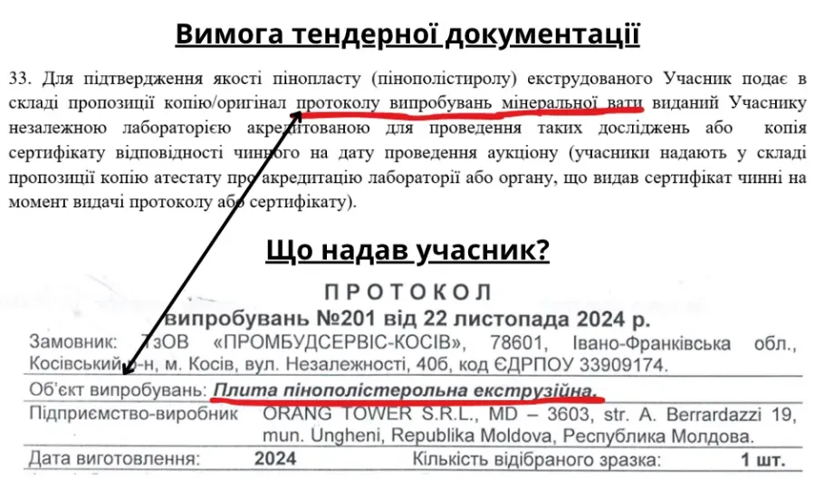 Для підтвердження якості пінопласту (екструдованого пінополістиролу) учасник мав подати протокол випробувань мінеральної вати, виданий учаснику незалежною лабораторією акредитованою для проведення таких досліджень, або сертифікат відповідності. Натомість учасник подав протокол на пінополістерольну екструзійну плиту, а не мінеральну вату, що не відповідає вимогам.