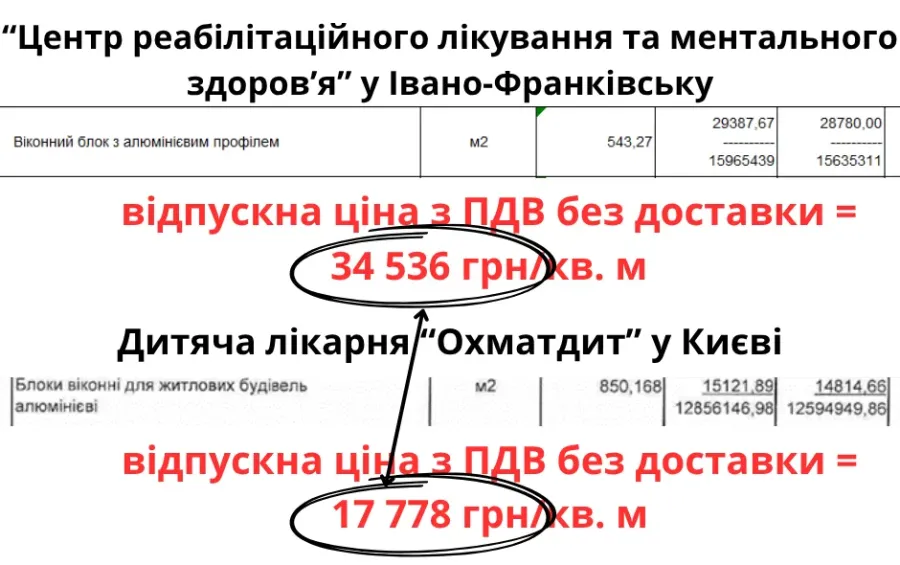 У інформації про ціни на матеріальні ресурси віконні блоки з алюмінієвим профілем замовили по 34 536 грн/кв. м (тут і далі ціни наведені з ПДВ та без доставки). «Маркет двері» пропонує алюмінієві вікна Alumil S77 по 16 000 грн/кв. м, що вдвічі дешевше. Нещодавно київська дитяча лікарня «Охматдит» замовляла алюмінієві віконні блоки по 17 778 грн/кв. м, що також вдвічі дешевше.