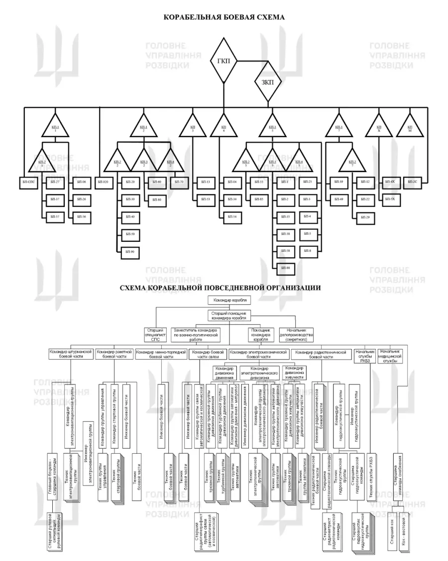 - бойова схема корабля, схеми систем забезпечення живучості та організаційної структури екіпажу;