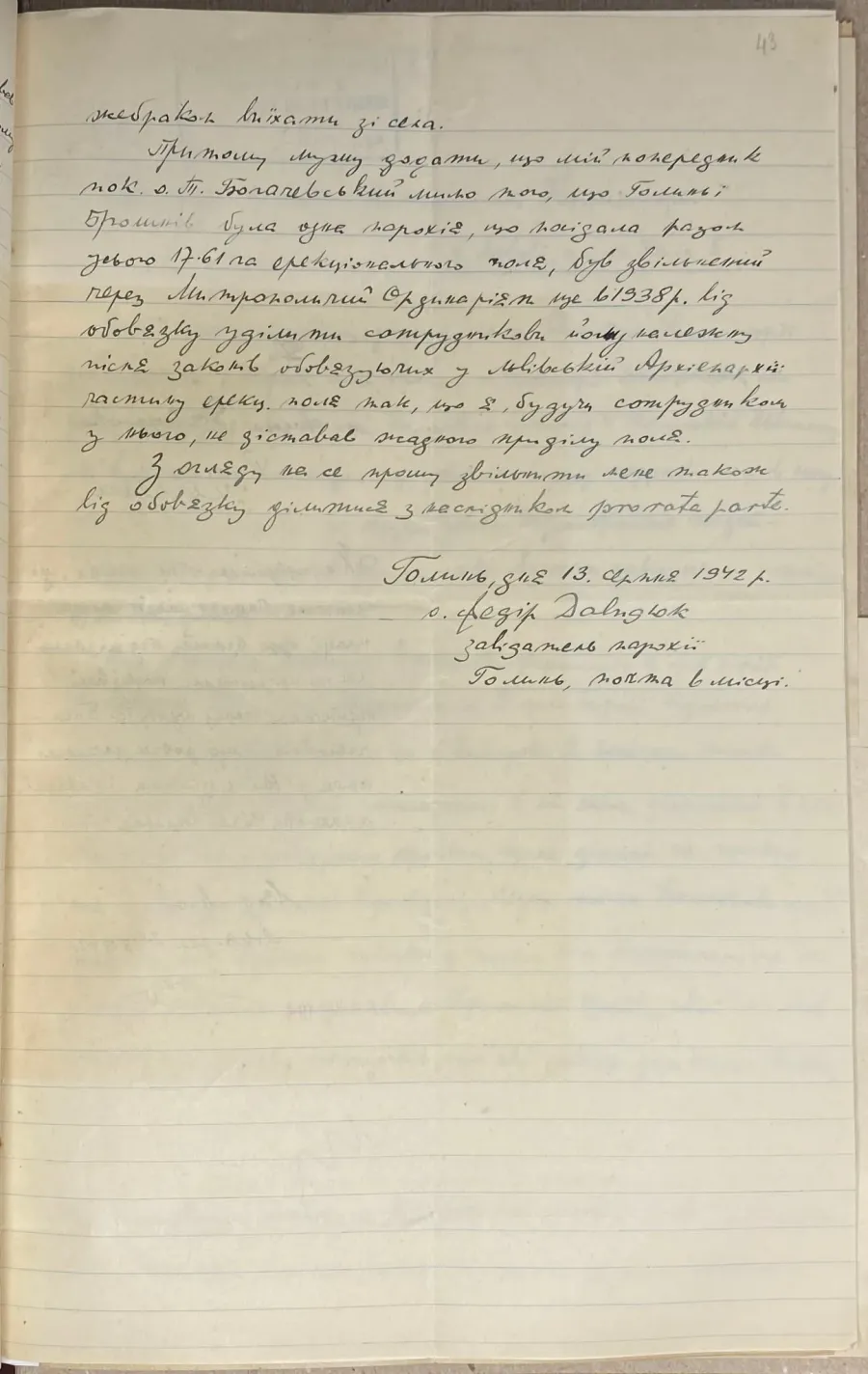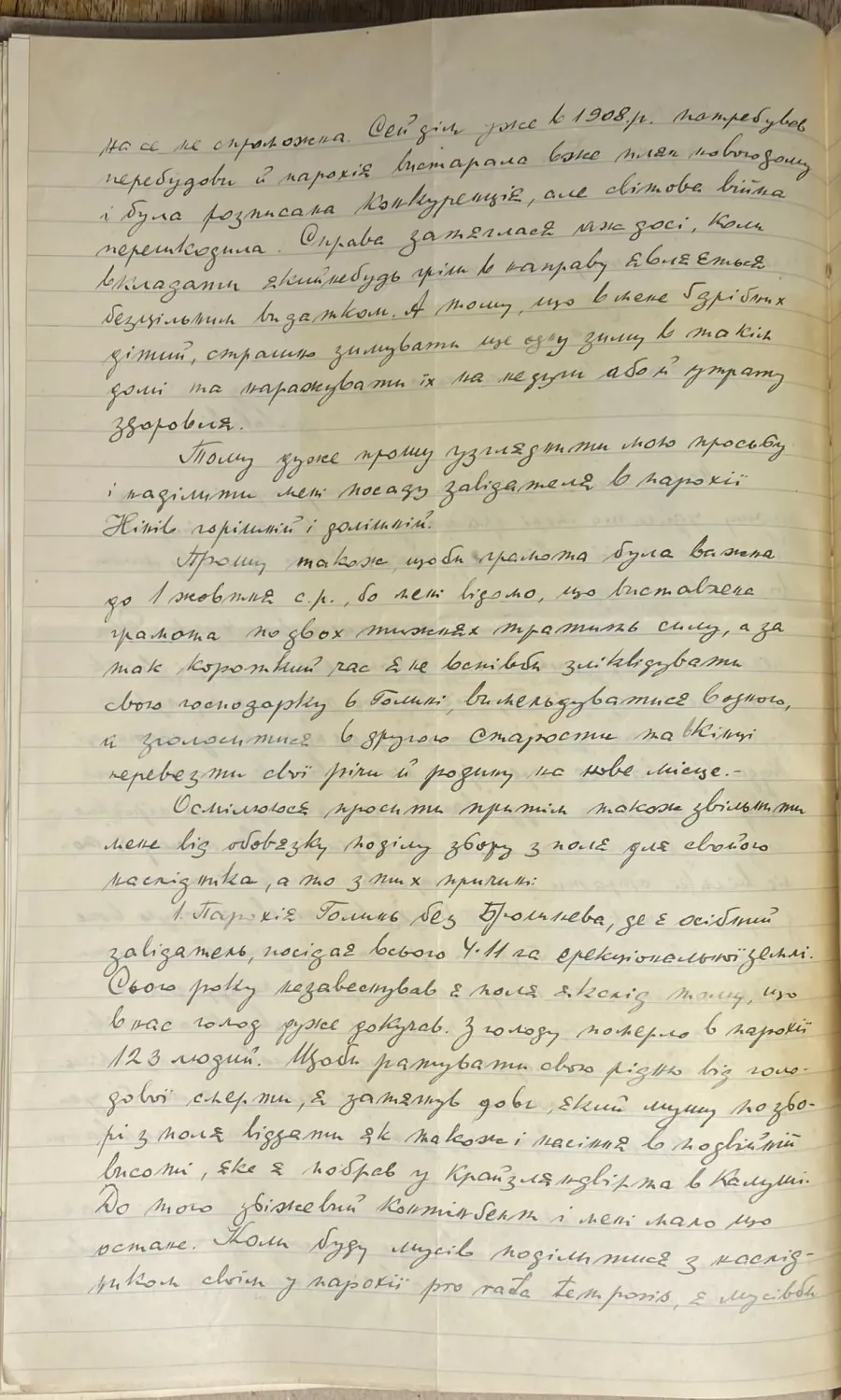 - В парохії Голинь я працюю вже 4 роки. Два перші як сотрудник пок.[ійного] о.[тця] Богачевського, другі два як завідатель парохії. Парохія Голинь числить понад 3000 душ і лежить при головному підкарпатському гостинці, куда відбувалися перемарші ріжних військ, а останнього року мандрували туди великі маси зголоджених гірських людей, які шукали хліба на Поділлі. На тому я поніс великі страти в господарстві і великі клопоти. З причини також недуги Базедова, на яку я хорую вже 7 літ, і як батько 5 дрібних дітей я змушений просити перенести мене на іншу душпастирську посаду, де я не мавби стільки праці в парохії і тільки клопотів.