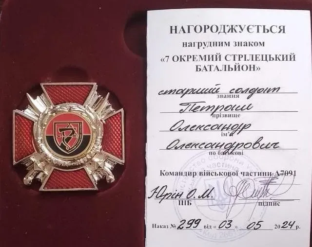 За сумлінну службу, патріотизм і вагомий внесок у захист суверенітету України, її територіальної цінності, відсіч та стримування збройної агресії Російської Федерації Олександр має ряд нагород від командира. Та найціннішим для нього є наручний годинник та нагрудний знак «7 окремий стрілецький батальйон».