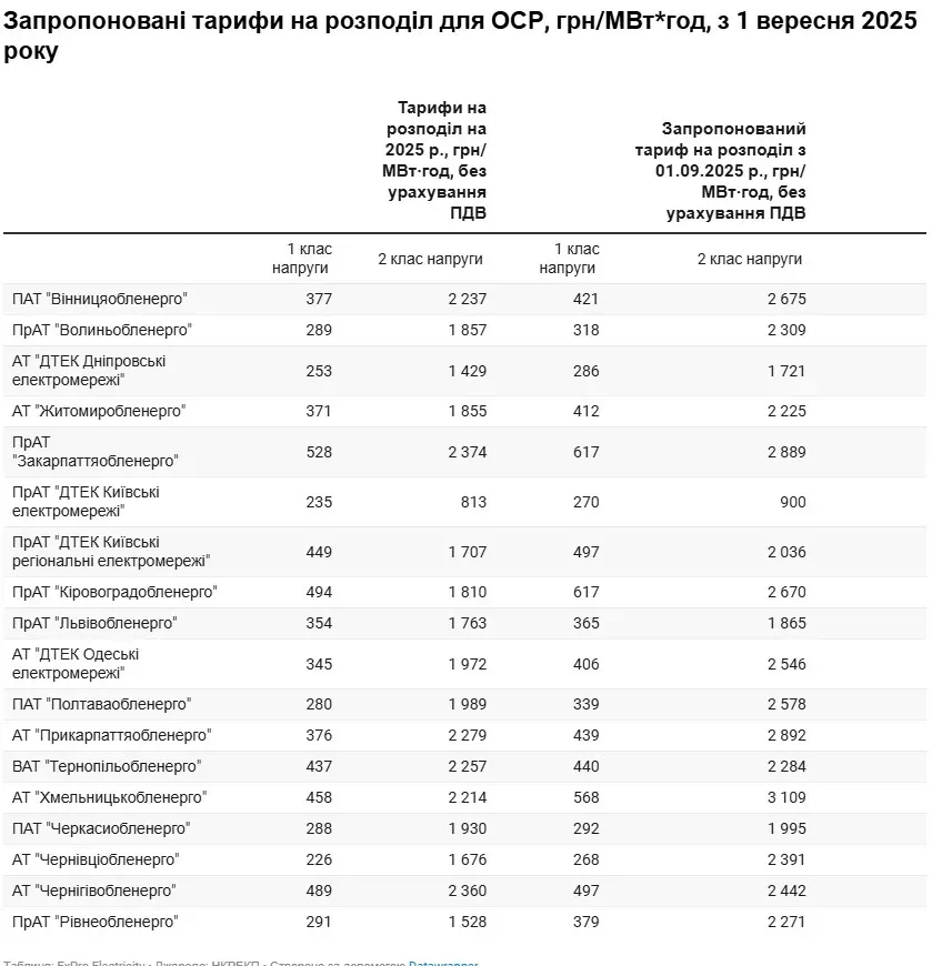За розрахунками ExPro, тарифи на послуги з розподілу для споживачів першого класу напруги планується збільшити в середньому на 14%, для другого класу напруги — на 23%. Найбільше можуть зрости тарифи для таких ОСР, як Рівнеобленерго, Кіровоградобленерго та Хмельницькобленерго. Найменше — для Чернігівобленерго, Черкасиобленерго та Львівобленерго.