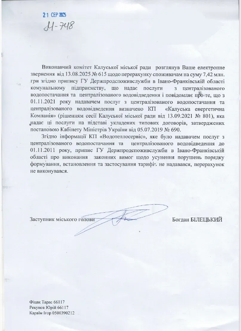 Відповідь надали 21 серпня. Зокрема, повідомили, що з 1 листопада 2021 року надавачем послуг з централізованого водопостачання і водовідведення визначено КП «Калуська енергетична компанія», яка надає ці послуги на підставі укладених типових договорів.