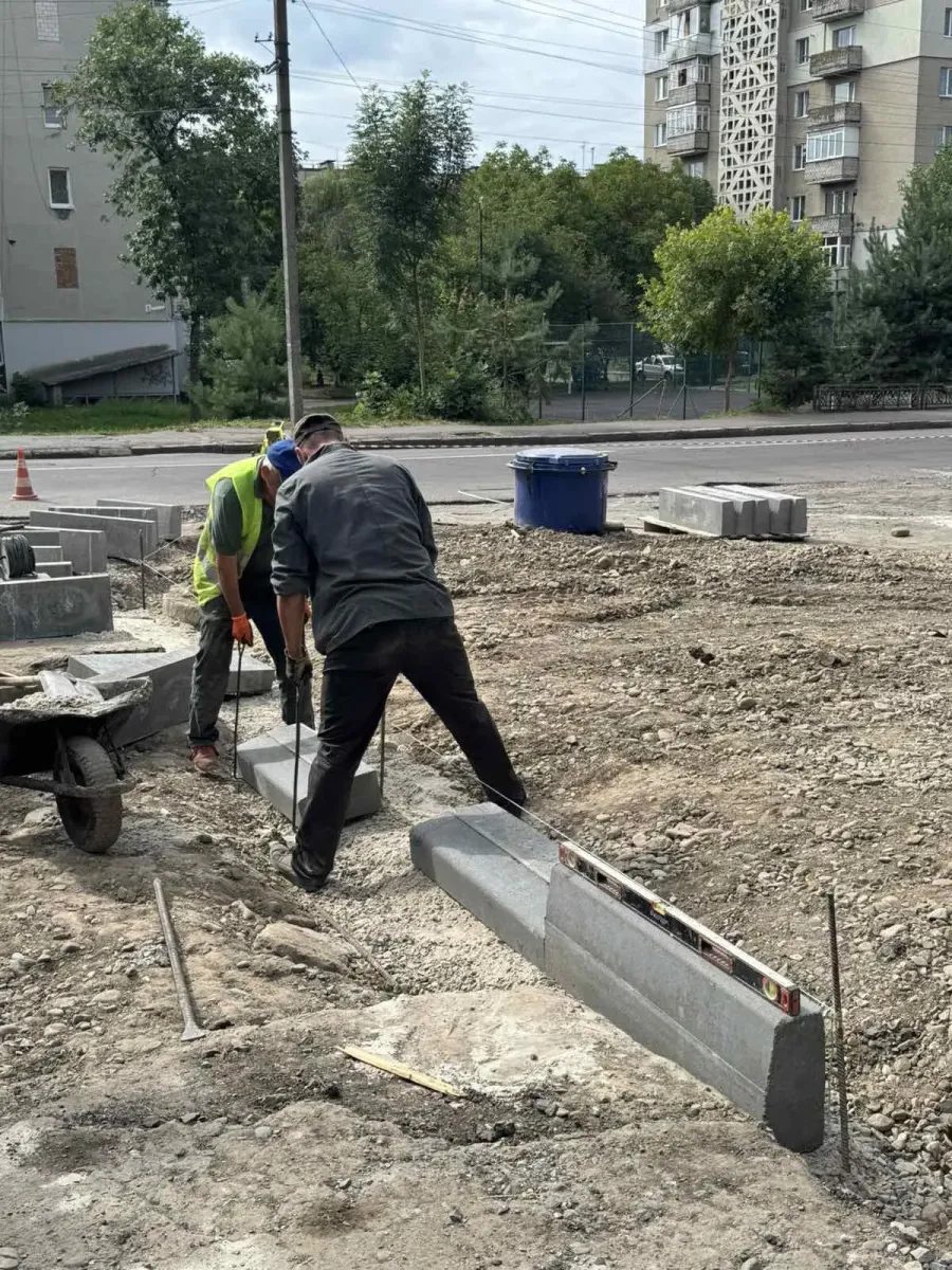 «Раніше троє людей старі бордюри зривали, а зараз будуть встановлювати. Робили відмітки, де поребрик встановлювати. Візуально робота матиме рух, адже чорнову уже зроблено. А коли з бордюром та поребриком буде фініш, то ще швидше робота піде. Асфальтуватимемо цю площу за один день, для чого будемо залучати всіх — і водіїв, і дорожників», — деталізує директор «Калушавтодору».