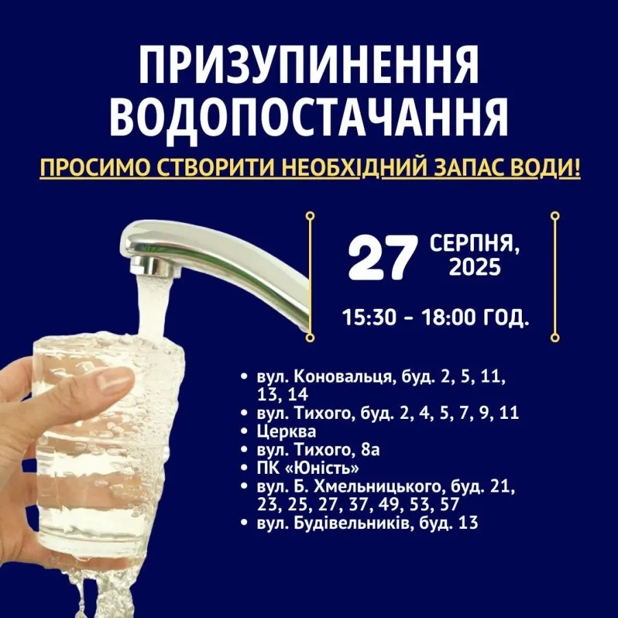 Комунальне підприємство "Калуська енергетична Компанія" повідомило про тимчасове призупинення водопостачання у середу, 27 серпня, з 15:30.