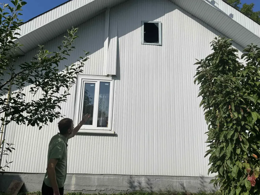 Чоловік Володимир показує два вибиті вікна на горищі та пошкоджений пластик на будинку.