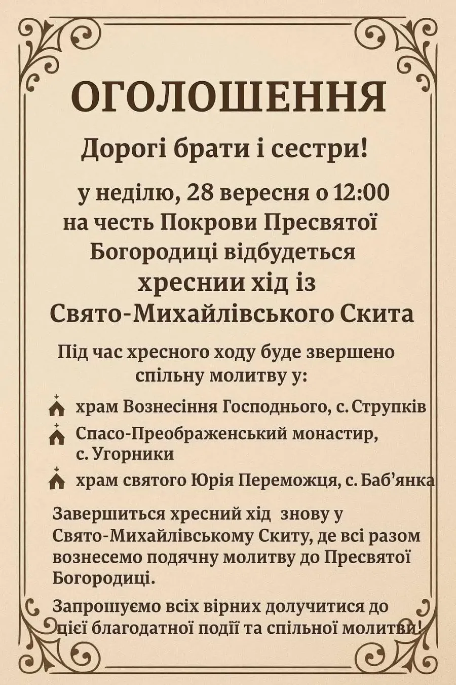 Завершиться хресний хід знову у Свято-Михайлівському Скиту, де будуть молитись до Пресвятої Богородиці.