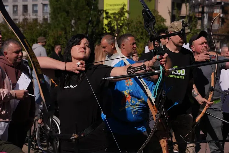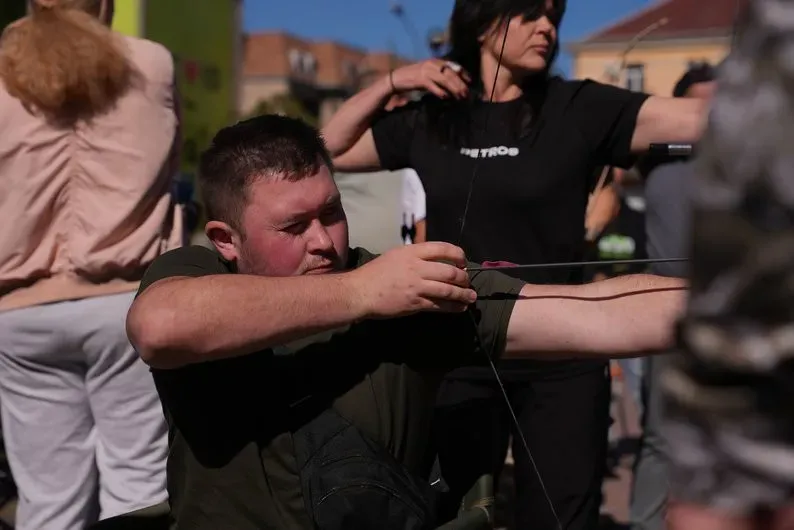 Ветеран Олександр Зірка проводив інструктаж для охочих постріляти з лука. Чоловік каже, що спорт дарує позитивні емоції та допомагає реабілітуватися.