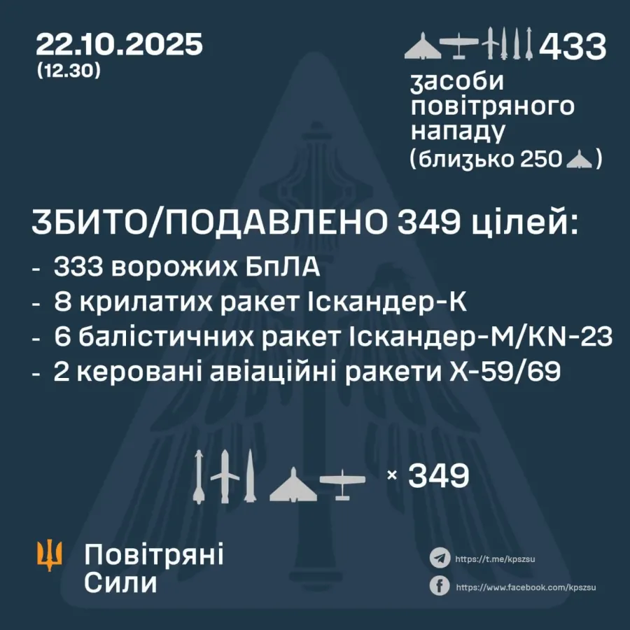 У ніч на 22 жовтня (з 19:00 21 жовтня) противник завдав комбінованого удару по об'єктах критичної інфраструктури України із застосуванням ударних БпЛА, ракет повітряного та наземного базування, повідомляють Повітряні сили.