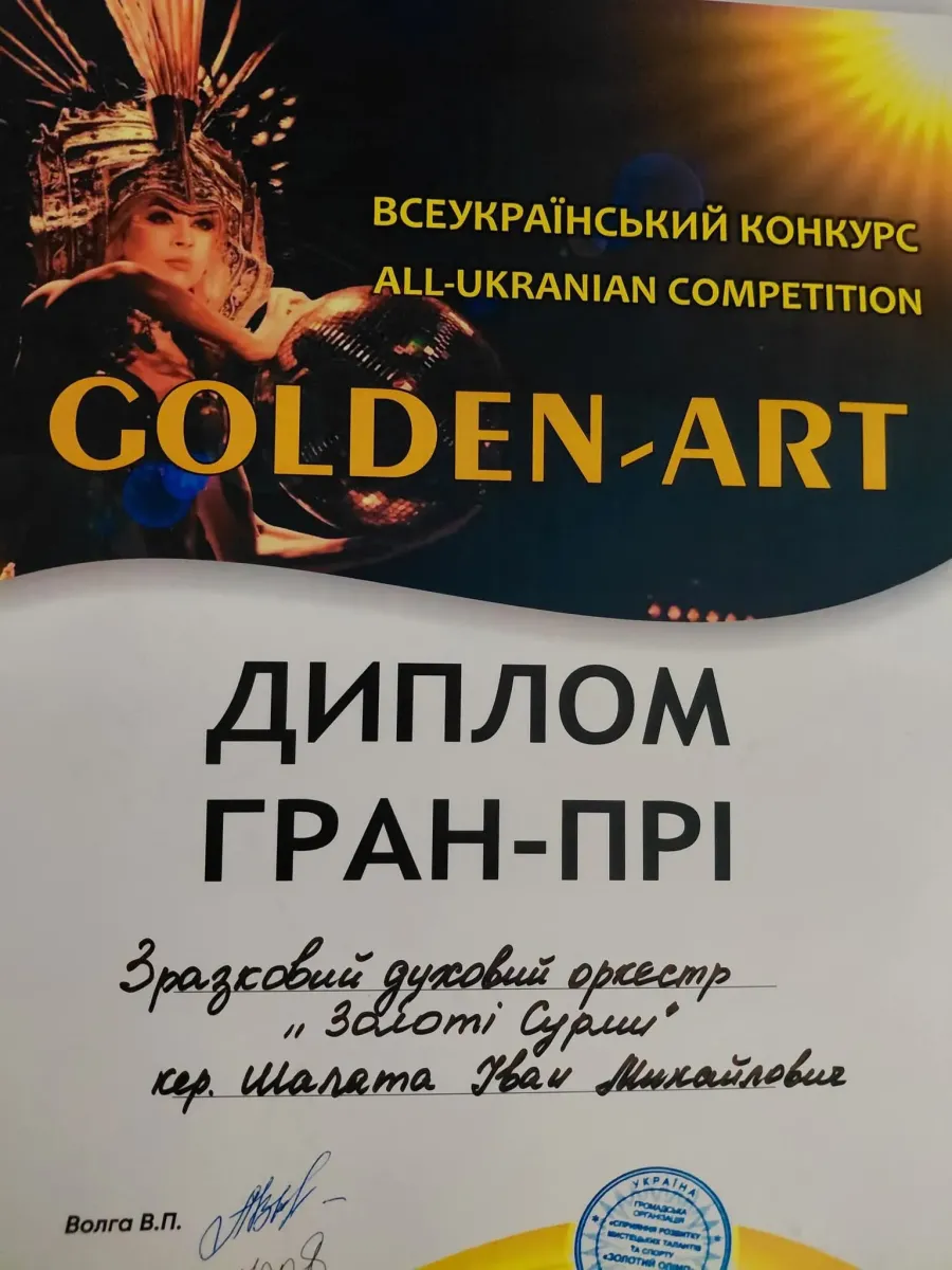 Зразковий духовий оркестр «Золоті Сурми» (керівники — Іван Шалата та Ярослав Гулимчук) та ансамбль мажореток «Сузір’я» (керівники — Ольга Квецко, Анастасія Лизень, тренер — Софія Король) стали призерами Всеукраїнського конкурсу мистецтв «Golden Art» в місті Ужгороді, повідомляє Управління культури, національностей та релігій міста Калуш.