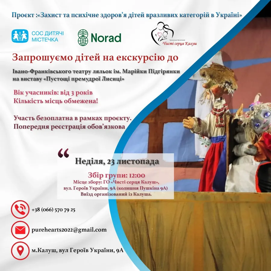 Екскурсія відбудеться у межах проєкту "Захист та психічне здоров’я дітей вразливих категорій в Україні" за підтримки СОС Дитячі Містечка Україна та фінансування Норвезької Агенції Співробітництва у Цілях Розвитку Norad.