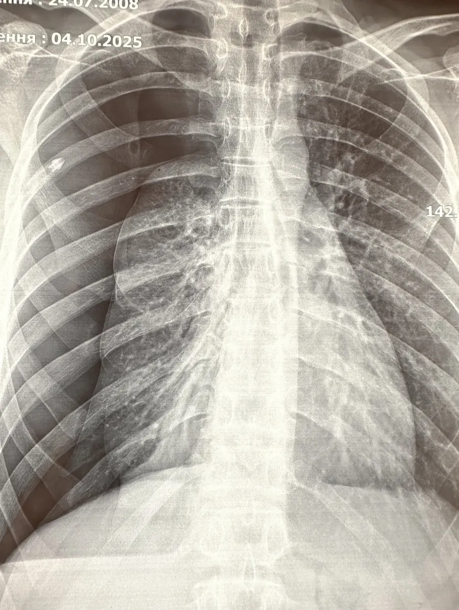 При обстеженні встановлено попередній діагноз — спонтанний пневмоторакс справа. Проведено дренування плевральної порожнини, але в динаміці ефекту в лікуванні не було. Про це на Фейсбук-сторінці написав генеральний директор лікарні Тарас Мельник.