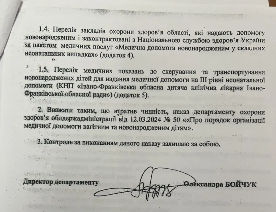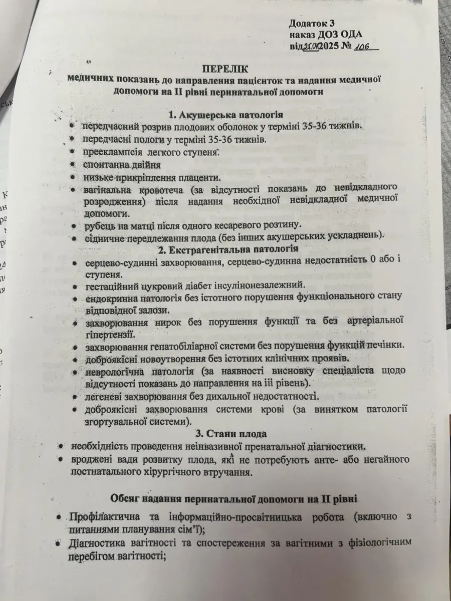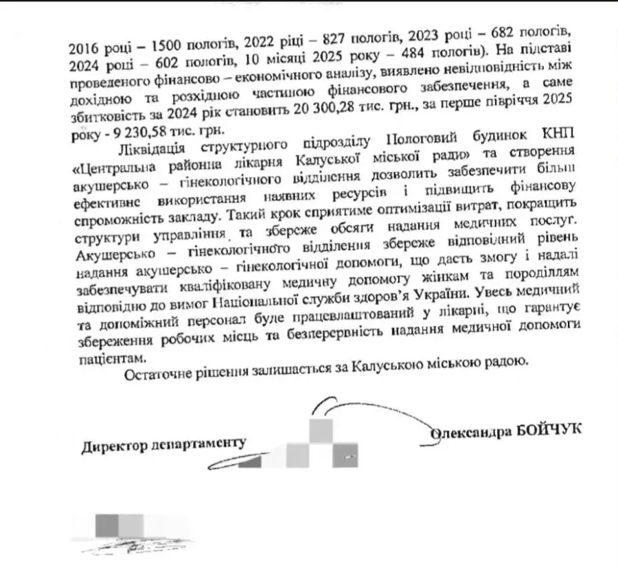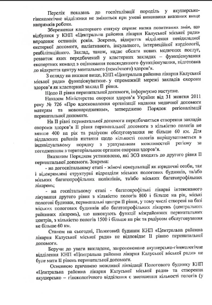 Також у листі зазначено, що «запропоноване акушерсько-гінекологічне відділення КНП «Центральна районна лікарня Калуської міської ради» не буде мати ІІ рівень перинатальної допомоги».
