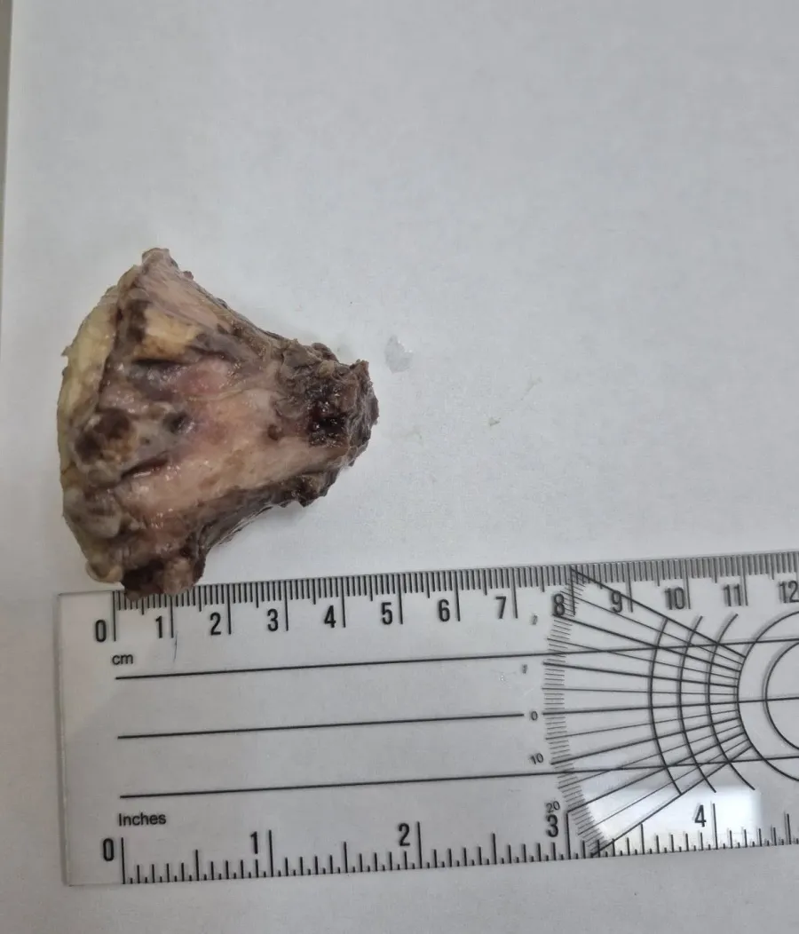 На консиліумі лікарів ухвалено рішення про проведення оперативного втручання. Під час операції хірурги видалили масивний кістково-хрящовий екзостоз. Отриманий матеріал направлено на патогістологічне дослідження для остаточної верифікації діагнозу. Післяопераційний період пройшов без ускладнень, стан пацієнта поступово покращувався.
