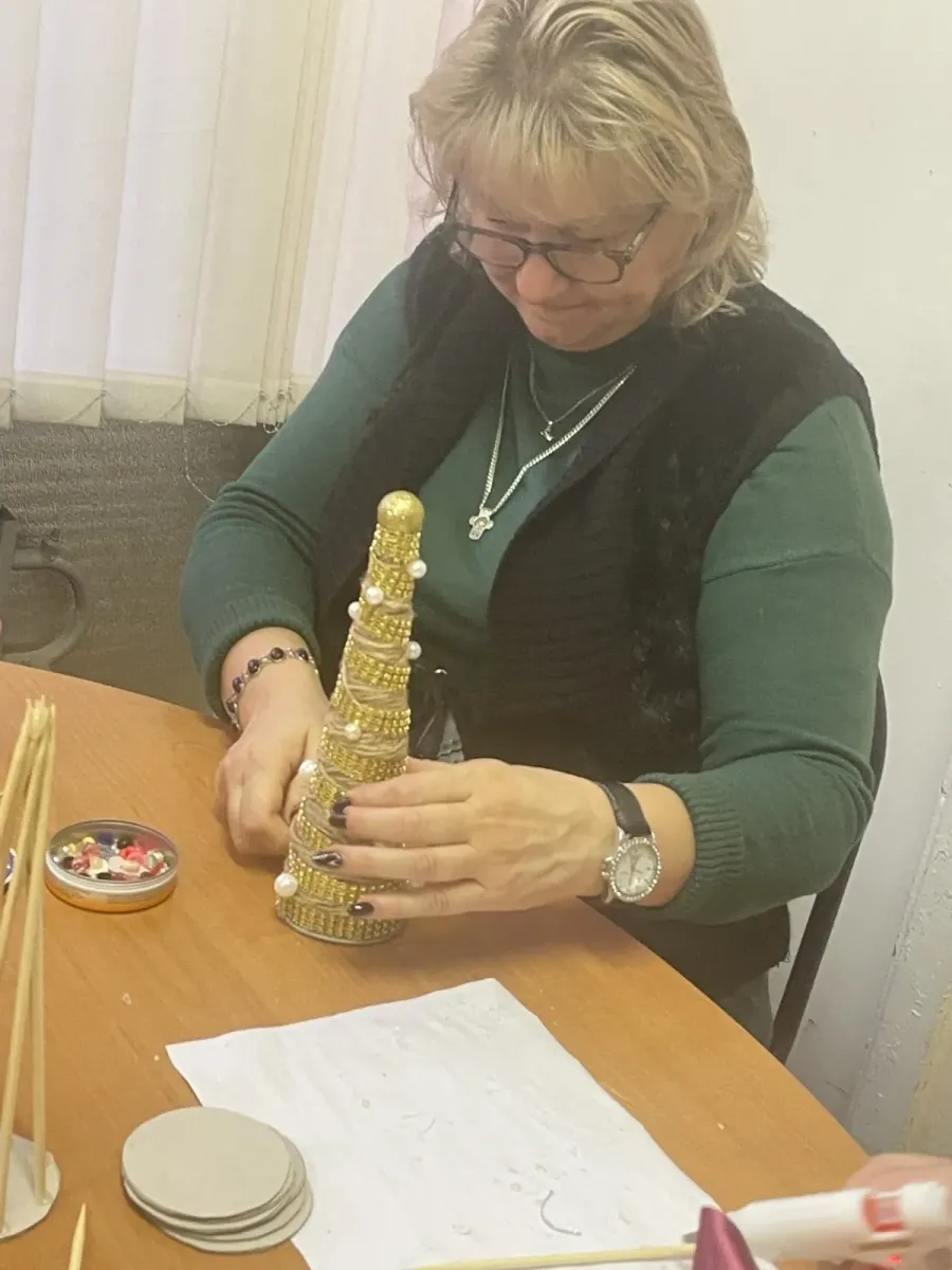 Присутні власноруч виготовляли святкові ялинки з джгута, прикрашаючи їх атласними стрічками, намистинками і прикрасами.