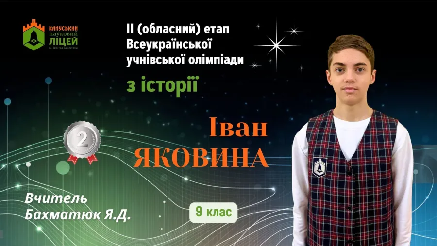 Переможною була й участь в обласній олімпіаді з історії учня 9-Б класу Івана Яковини, який здобув ІІ місце. Вчитель переможця — Ярослав Бахматюк.