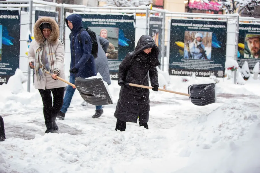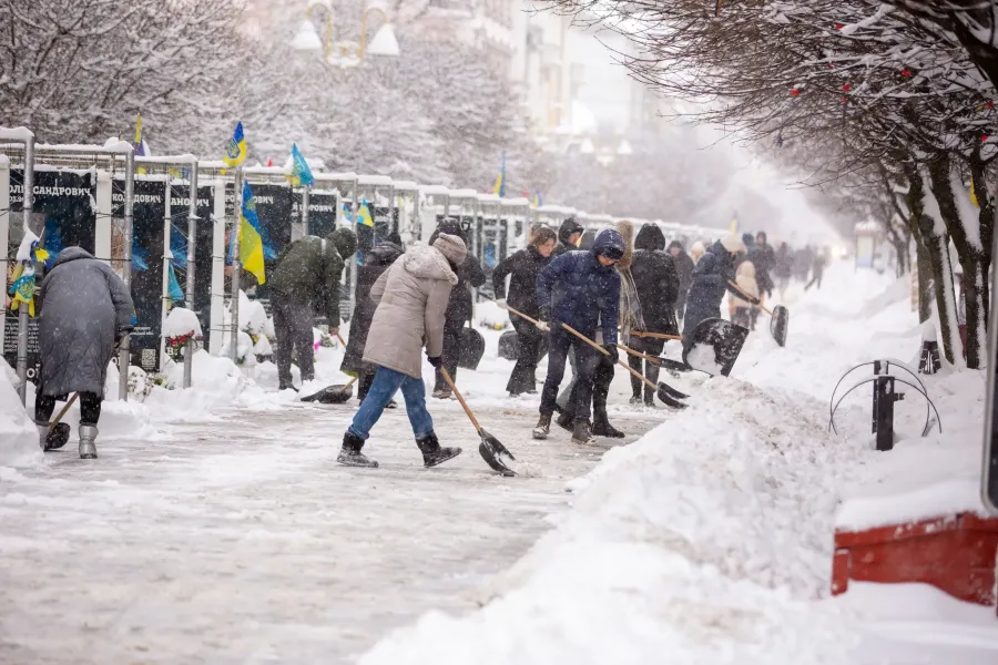 Також долучаються містяни, хто працює біля установ, закладів чи інституцій. Пан Володимир, прибиральник в «Укрексімбанку», вийшов на роботу ще звечора: