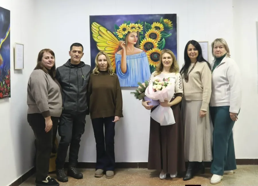 Особливе місце у виставці займає найдорожча для художниці картина — ангел з одним крилом, замість іншого — соняхи. Цей образ уже став знаковим: у серпні 2025 року за ініціативою Ольги Чолінської та її ескізом на фасаді міської бібліотеки було створено мурал за однойменним сюжетом.