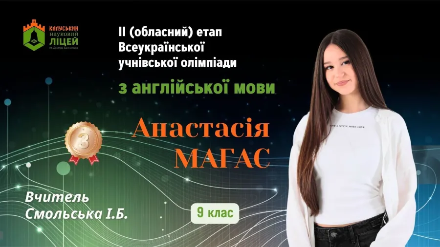 - ІІІ місце — учениця 9-В класу Анастасія Магас (вчителька Ірина Смольська).
