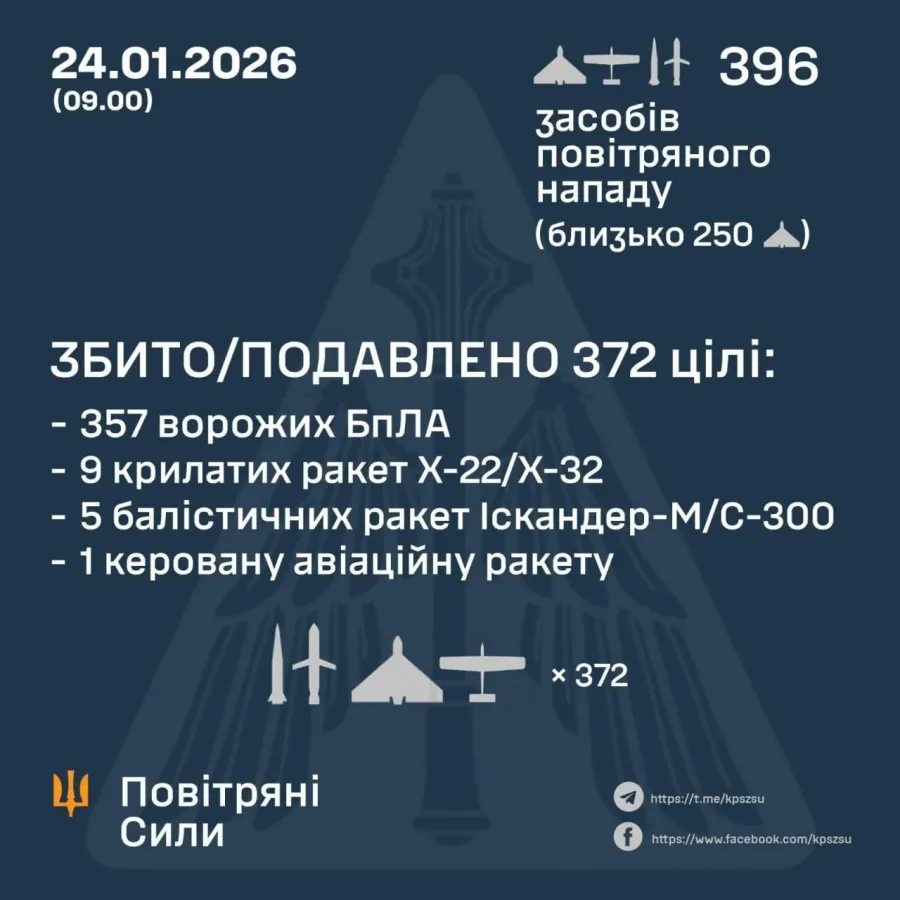 4 січня (з 18:00 23 січня) противник здійснив комбінований удар по Україні із застосуванням ракет різних типів повітряного, наземного базування та ударних БпЛА, повідомляють Повітряні сили.