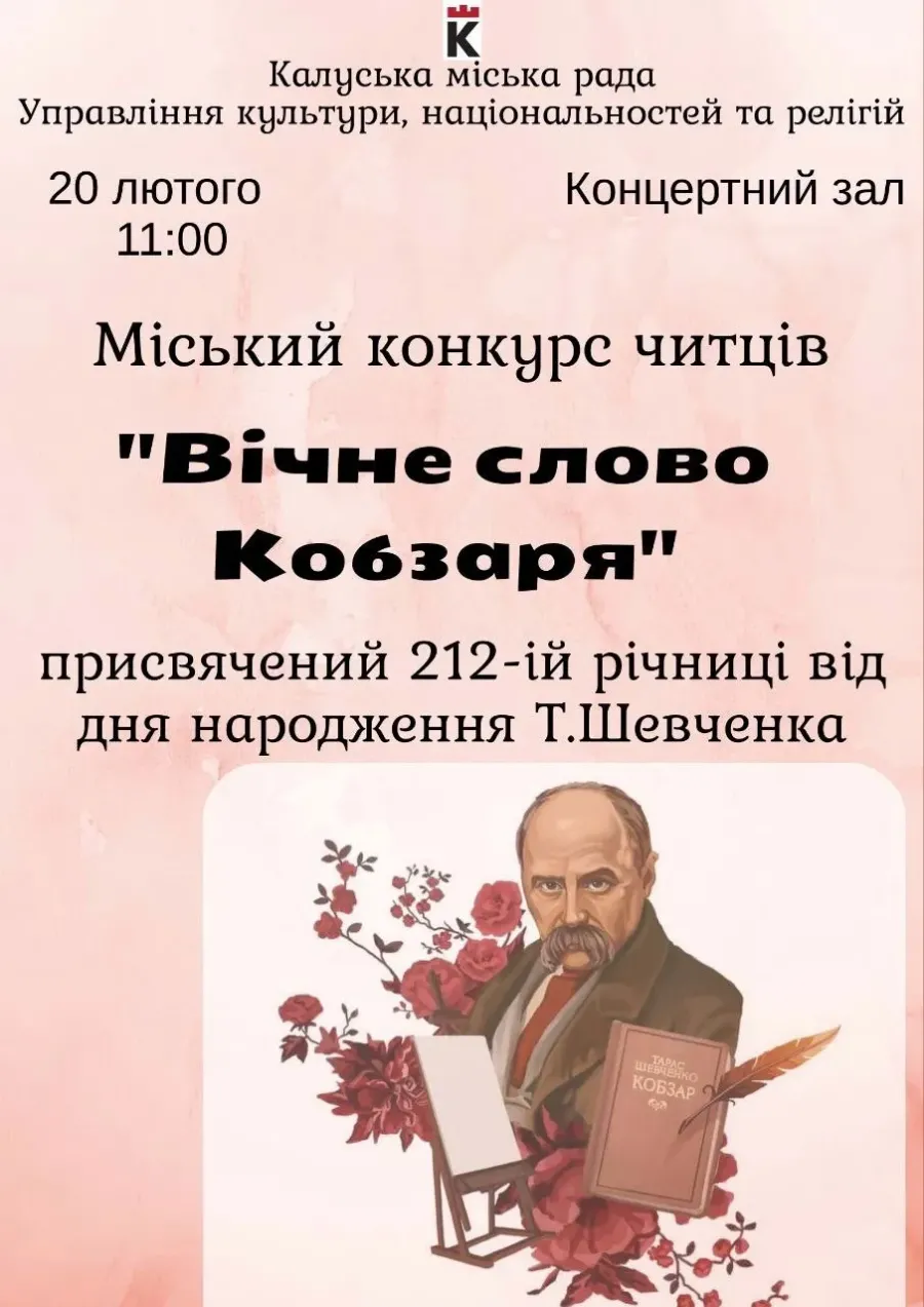 Конкурс "Вічне слово Кобзаря" відбудеться 20 лютого у приміщенні Концертної зали (м. Калуш, вул. Т. Шевченка, 11). Початок об 11:00, інформують "Вікна" з посиланням на Калуську міську раду.