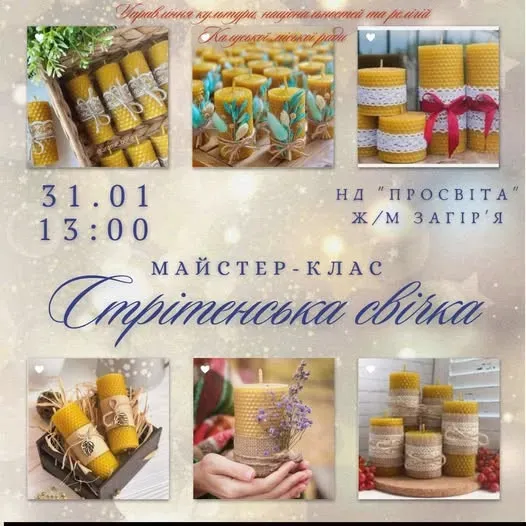 Творчий майстерклас "Стрітенська свічка" відбудеться у суботу, 31 січня, у Народному домі "Просвіта" в житловому масиві Загір’я. Початок о 13:00.