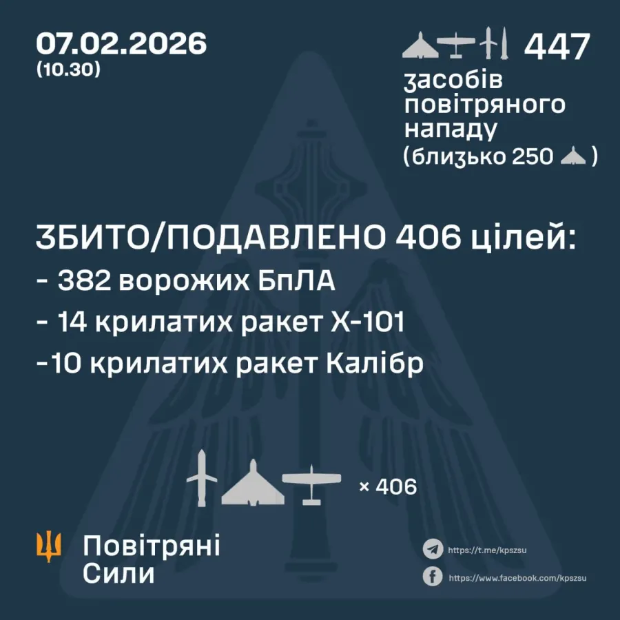 У ніч на 07 лютого (з 19:00 06 лютого) противник завдав комбінованого удару по об'єктах критичної інфраструктури України із застосуванням ударних БпЛА, ракет повітряного, наземного та морського базування. Усього радіотехнічними військами Повітряних Сил зафіксовано 447 засобів повітряного нападу: